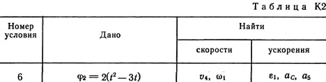 В столбце "Дано" таблицы указан закон движения или закон изменения скорости ведущего звена механизма, где φ1(t) - закон вращения колеса 1, s2(f) - закон движения рейки 4, ω2(t) - закон изменения угловой скорости колеса 2, v5(t) - закон изменения скорости груза 5 и т. д. (везде φ выражено в радианах, s - в сантиметрах, t - в секундах). Положительное направление для φ и ω против хода часовой стрелки, для s4, s5 и v4, v5 - вниз.