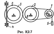 Механизм состоит из ступенчатых колес 1 - 3, находящихся в зацеплении или связанных ременной передачей, зубчатой рейки 4 и груза 5, привязанного к концу нити, намотанной на одно из колес (рис. К2.0 - К2.9, табл. К2). Радиусы ступеней колес равны соответственно: у колеса 1 - r1 = 2 см, R1 = 4 см, у колеса 2 - r2 = 6 см, R2 = 8 см, у колеса 3 - r3 = 12 см, R3 = 16 см. На ободьях колес расположены точки A, В и С.