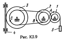 Механизм состоит из ступенчатых колес 1 - 3, находящихся в зацеплении или связанных ременной передачей, зубчатой рейки 4 и груза 5, привязанного к концу нити, намотанной на одно из колес (рис. К2.0 - К2.9, табл. К2). Радиусы ступеней колес равны соответственно: у колеса 1 - r1 = 2 см, R1 = 4 см, у колеса 2 - r2 = 6 см, R2 = 8 см, у колеса 3 - r3 = 12 см, R3 = 16 см. На ободьях колес расположены точки A, В и С.