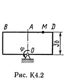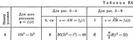 По пластине вдоль прямой BD (рис. 0 - 4) или по окружности радиуса R (рис. 5 - 9) движется точка М; закон ее относительного движения, т.е. зависимость s = AM = f2(t) (s выражено в сантиметрах, t - в секундах), задан в таблице отдельно для рис. 0 - 4 и для рис. 5 - 9; там же даны размеры b и l. На рисунках точка М показана в положении, при котором s = АМ > 0 (при s < 0 точка М находится по другую сторону от точки А).
