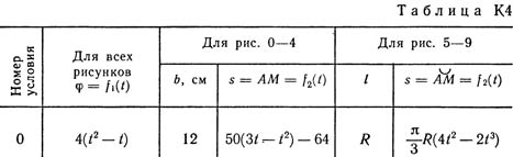 По пластине вдоль прямой BD (рис. 0 - 4) или по окружности радиуса R (рис. 5 - 9) движется точка М; закон ее относительного движения, т.е. зависимость s = AM = f2(t) (s выражено в сантиметрах, t - в секундах), задан в таблице отдельно для рис. 0 - 4 и для рис. 5 - 9; там же даны размеры b и l. На рисунках точка М показана в положении, при котором s = АМ > 0 (при s < 0 точка М находится по другую сторону от точки А).