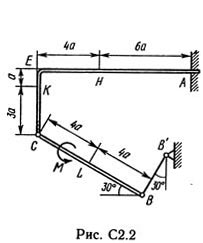 На каждую конструкцию действуют: пара сил с моментом М = 60 кН·м, равномерно распределенная нагрузка интенсивности q = 20 кН/м и еще две силы. Эти силы, их направления и точки приложения указаны в табл. С2; там же в столбце «Нагруженный участок» указано, на каком участке действует распределенная нагрузка (например, в условиях № 1 на конструкцию действуют сила F2 под углом 60° к горизонтальной оси, приложенная в точке L, сила F4 под углом 30° к горизонтальной оси, приложенная в точке Е, и нагрузка, распределенная на участке СK).