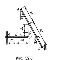 На каждую конструкцию действуют: пара сил с моментом М = 60 кН·м, равномерно распределенная нагрузка интенсивности q = 20 кН/м и еще две силы. Эти силы, их направления и точки приложения указаны в табл. С2; там же в столбце «Нагруженный участок» указано, на каком участке действует распределенная нагрузка (например, в условиях № 1 на конструкцию действуют сила F2 под углом 60° к горизонтальной оси, приложенная в точке L, сила F4 под углом 30° к горизонтальной оси, приложенная в точке Е, и нагрузка, распределенная на участке СK).