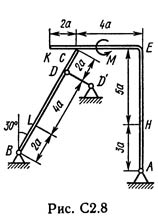 Конструкция состоит из жесткого угольника и стержня, которые в точке С или соединены друг с другом шарнирно (рис. С2.0 — С2.5), или свободно опираются друг о друга (рис. С2.6 — С2.9). Внешними связями, наложенными на конструкцию, являются в точке А или шарнир, или жесткая заделка; в точке В или гладкая плоскость (рис. 0 и 1), или невесомый стержень ВВ' (рис. 2 и 3), или шарнир (рис. 4—9); в точке D или невесомый стержень DD' (рис. 0, 3, 8), или шарнирная опора на катках (рис. 7).