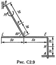 На каждую конструкцию действуют: пара сил с моментом М = 60 кН·м, равномерно распределенная нагрузка интенсивности q = 20 кН/м и еще две силы. Эти силы, их направления и точки приложения указаны в табл. С2; там же в столбце «Нагруженный участок» указано, на каком участке действует распределенная нагрузка (например, в условиях № 1 на конструкцию действуют сила F2 под углом 60° к горизонтальной оси, приложенная в точке L, сила F4 под углом 30° к горизонтальной оси, приложенная в точке Е, и нагрузка, распределенная на участке СK).