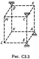 Шесть невесомых стержней соединены своими концами шарнирно друг с другом в двух узлах и прикреплены другими концами (тоже шарнирно) к неподвижным опорам А, В, С, D (рис. С3.0 - С3.9, табл. С3). Стержни и узлы (узлы расположены в вершинах H, К, L или М прямоугольного параллелепипеда) на рисунках не показаны и должны быть изображены решающим задачу по данным таблицы. В узле, который в каждом столбце таблицы указан первым, приложена сила Р = 200 Н; во втором узле приложена сила Q = 100 Н. Сила Р образует с положительными направлениями координатных осей х, у, z углы, равные соответственно α1 = 45°, β1 = 60°, γ1 = 60°, а сила Q - углы α2 = 60°, β2 = 45°, γ2 = 60°; направления осей х, у, z для всех рисунков показаны на рис. С3.0.