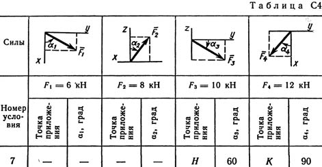На плиты действуют пара сил с моментом М = 4 кН·м, лежащая в плоскости одной из плит, и две силы. Значения этих сил, их направления и точки приложения указаны в табл. С4; при этом силы F1 и F4 лежат в плоскостях, параллельных плоскости ху, сила F2 - в плоскости, параллельной xz, и сила F3 - в плоскости, параллельной yz. Точки приложения сил (D, Е, Н, К) находятся в углах или в серединах сторон плит.