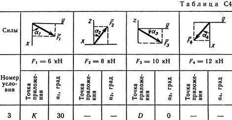 На плиты действуют пара сил с моментом М = 4 кН·м, лежащая в плоскости одной из плит, и две силы. Значения этих сил, их направления и точки приложения указаны в табл. С4; при этом силы F1 и F4 лежат в плоскостях, параллельных плоскости ху, сила F2 - в плоскости, параллельной xz, и сила F3 - в плоскости, параллельной yz. Точки приложения сил (D, Е, Н, К) находятся в углах или в серединах сторон плит.