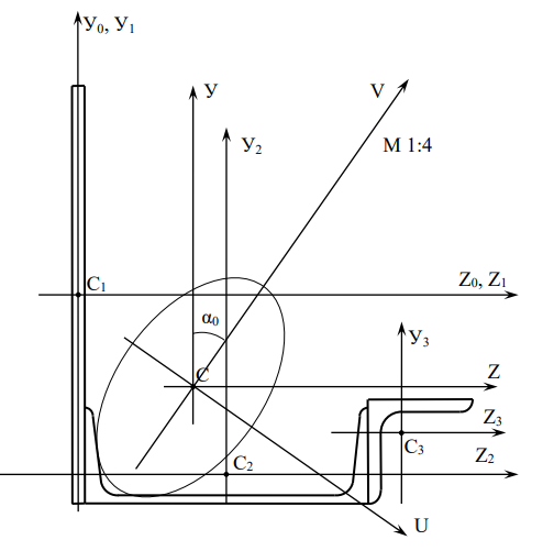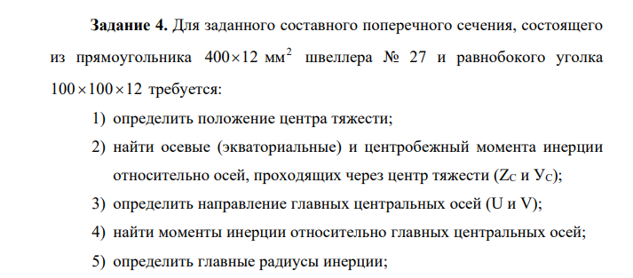 Для заданного составного поперечного сечения, состоящего из прямоугольника швеллера № 27 и равнобокого уголка требуется: 1) определить положение центра тяжести; 2) найти осевые (экваториальные) и центробежный момента инерции относительно осей, проходящих через центр тяжести (ZC и УC); 3) определить направление главных центральных осей (U и V); 4) найти моменты инерции относительно главных центральных осей; 5) определить главные радиусы инерции;