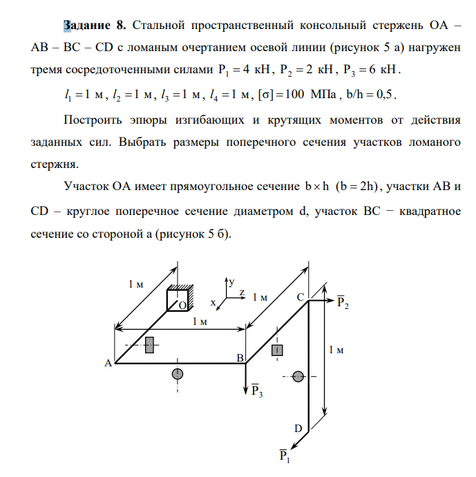 Стальной пространственный консольный стержень ОА – АВ – ВС – СD с ломаным очертанием осевой линии (рисунок 5 а) нагружен тремя сосредоточенными силами Р1 = 4 кН , Р2 = 2 кН , Р3 = 6 кН . l 1 =1 м , l 2 =1 м, l 3 =1 м , l 4 =1 м, [σ] =100 МПа , b/h = 0,5. Построить эпюры изгибающих и крутящих моментов от действия заданных сил. Выбрать размеры поперечного сечения участков ломаного стержня. Участок OA имеет прямоугольное сечение b  h (b = 2h) , участки АВ и СD – круглое поперечное сечение диаметром d, участок ВС − квадратное сечение со стороной а (рисунок 5 б)