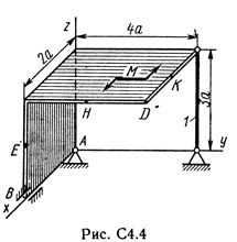 На плиты действуют пара сил с моментом М = 4 кН·м, лежащая в плоскости одной из плит, и две силы. Значения этих сил, их направления и точки приложения указаны в табл. С4; при этом силы F1 и F4 лежат в плоскостях, параллельных плоскости ху, сила F2 - в плоскости, параллельной xz, и сила F3 - в плоскости, параллельной yz. Точки приложения сил (D, Е, Н, К) находятся в углах или в серединах сторон плит.