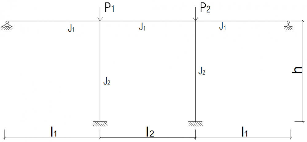 l1 = 5 м; l2 = 13 м; h1 = 10 м; α = P1 / P2 = 2,5; J1 : J2 = 0,8