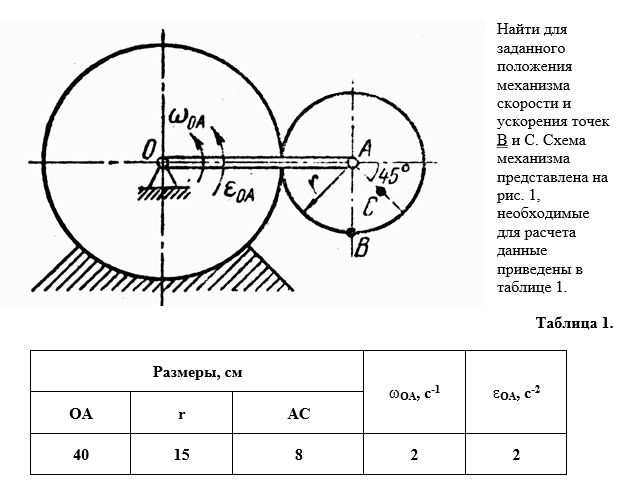 Найти для заданного положения механизма скорости и ускорения точек В и С. Схема механизма представлена на рис. 1, необходимые для расчета данные приведены в таблице 1.