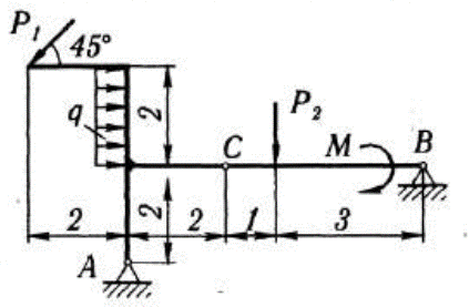 Дано: Р1= 10 кН, Р2= 7 кН, М = 20 кНм; q= 2 кН/м;