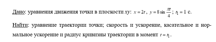 По заданным уравнениям движения точки M: x=x(t)(см), y=y(t)(см)-установить вид ее траектории и для момента времени t=t1(c) найти положение точки на траектории, ее скорость, полное, касательное и нормальное ускорения, а также радиус кривизны траектори