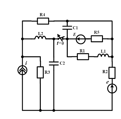Элементы схемы имеют следующие параметры:E=4 В, Em=2 В, Im=0,1 А, , R1=60 Ом, R2=75 Ом, R3=65 Ом, R4=82 Ом, R5=41 Ом, L1=25 мГн, L2=35 мГн, C1=8,2 мкФ, C2=7,5 мкФ.