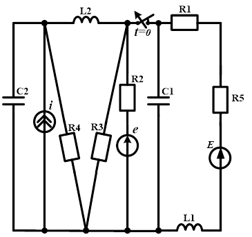 Элементы схемы имеют следующие параметры:E=4 В, Em=3 В, Im=0,2 А,, R1=70 Ом, R2=90 Ом, R3=110 Ом, R4=95 Ом, R5=40 Ом, L1=58 мГн, L2=62 мГн, C1=4 мкФ, C2=3 мкФ