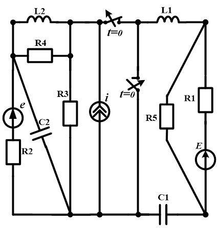 Элементы схемы имеют следующие параметры:E=4,6 В, Em=2 В, Im=0,2 А, , , , R1=78 Ом, R2=89 Ом, R3=95 Ом, R4=100 Ом, R5=79 Ом, L1=60 мГн, L2=52 мГн, C1=4 мкФ, C2=3,2 мкФ.