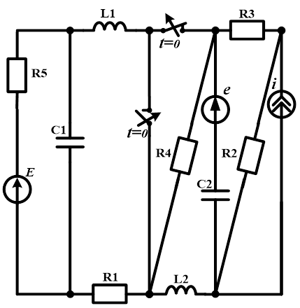 Элементы схемы имеют следующие параметры:E=6,5 В, Em=2,5 В, Im=0,3 А, , R1=81 Ом, R2=86 Ом, R3=90 Ом, R4=70 Ом, R5=55 Ом, L1=42 мГн, L2=32 мГн, C1=8,4 мкФ, C2=5,7 мкФ.