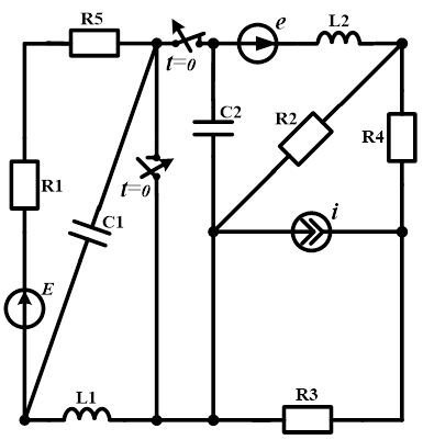 Элементы схемы имеют следующие параметры:E=3,3 В, Em=2 В, Im=0,1 А, , , R1=90 Ом, R2=80 Ом, R3=85 Ом, R4=92 Ом, R5=69 Ом, L1=34 мГн, L2=44 мГн, C1=9,5 мкФ, C2=4,5 мкФ.