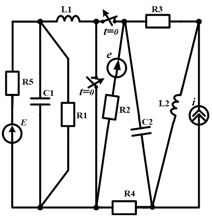 Элементы схемы имеют следующие параметры:E=4,2 В, Em=2 В, Im=0,15 А,, R1=85 Ом, R2=70 Ом, R3=95 Ом, R4=92 Ом, R5=49 Ом, L1=30 мГн, L2=40 мГн, C1=8,5 мкФ, C2=6,2 мкФ.