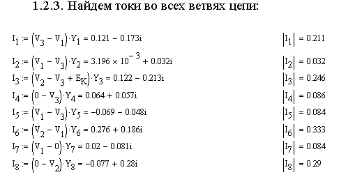 В данном отчете присутствуют все необходимые расчеты токов, напряжений, сопротивлений ветвей цепи; линеаризованные схемы и графики напряжений и токов. Пример расчета токов во всех ветвях цепи: