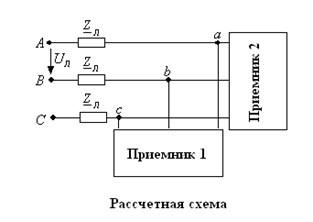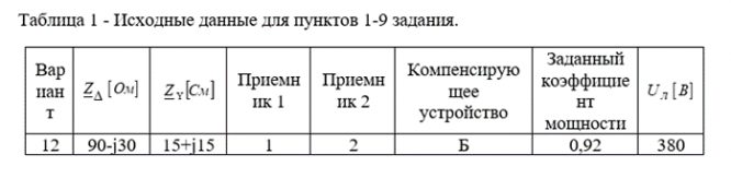 Рассчитать заданный вариант симметричной трехфазной цепи, изображенной на рисунке 1, т.е. найти токи, напряжения и мощности всех участков, пользуясь методами преобразования цепи (в комплексной форме).