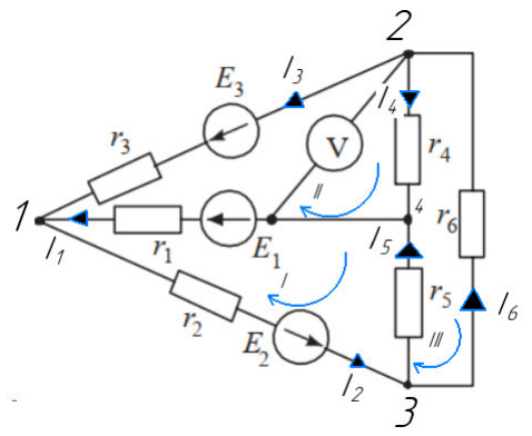 2) Составить уравнения по методу контурных токов в матричной форме и определить все неизвестные токи в ветвях.