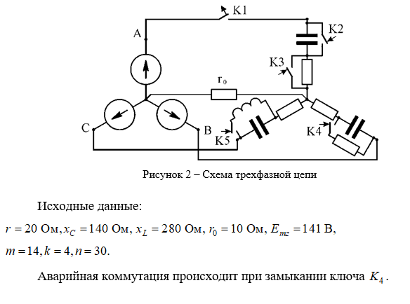 В симметричной трёхфазной цепи, представляющей собой соединение генератора и приёмника, возникает аварийная ситуация в виде короткого замыкания или обрыва провода, приводящая через определённое время к установившемуся несимметричному режиму. Для цепи, соответствующей конкретному варианту: