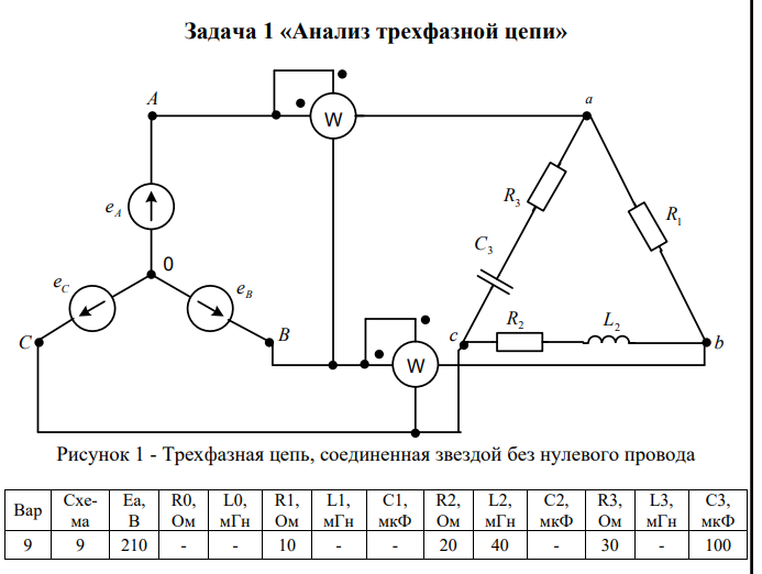 Задача 1 «Анализ трехфазной цепи» В линейной электрической цепи, схема и параметры которой приведены ниже, действует трехфазный источник напряжения.