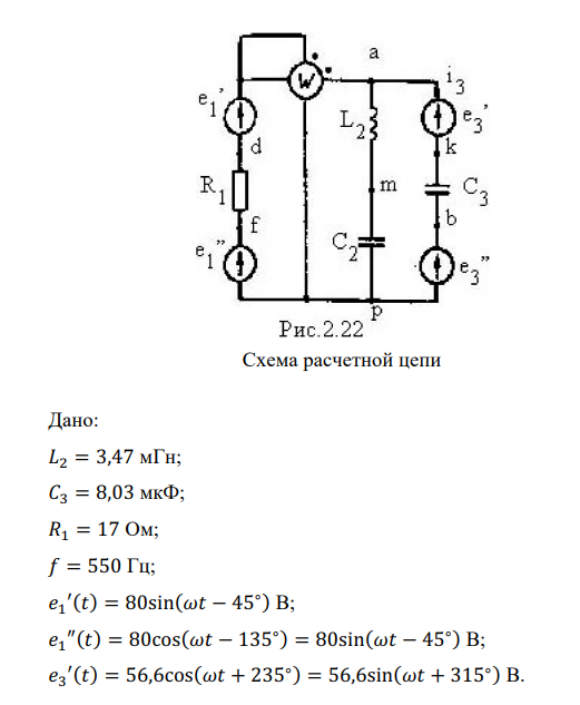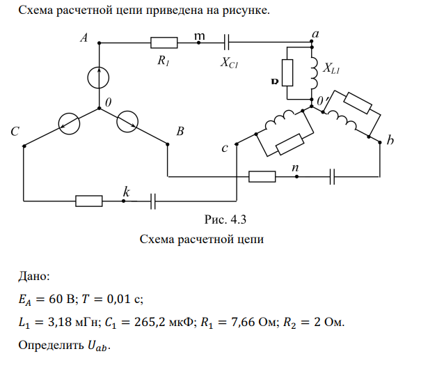 Для заданной расчетной цепи требуется: рассчитать токи, построить векторную диаграмму токов и напряжений, определить мгновенное значение напряжения между указанными точками и показать изображающий вектор этой величины на векторной диаграмме, сделать проверку по законам Кирхгофа для одной фазы, подсчитать активную мощность трехфазной системы.