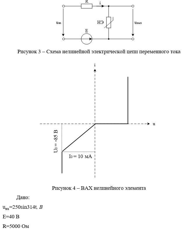 Задача №2 Расчет нелинейной цепи переменного тока. Нелинейные резистивные цепи Электрическая цепь, состоящая из последовательно соединенных линейного резистора R, нелинейного резистора HЭ и источника постоянной ЭДС Е, подключена к источнику синусоидального напряжения uвх(t)=Umsinωt. В зависимости от номера n, под которым фамилия студента записана в групповом журнале, цепь имеет два варианта: