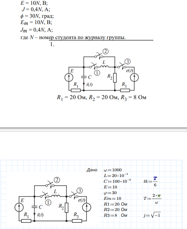 Рассчитать переходный процесс в цепи второго порядка, которая состоит из двух источников, один из которых – источник постоянного тока или ЭДС, другой – источник гармонического тока (J(t) = Jm sin(ωt + ϕ)) или напряжения (e(t) = Em sin(ωt + ϕ)) c угловой частотой ω = 1000 рад/с .