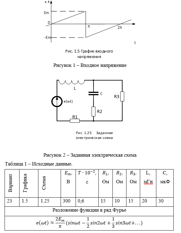 1. Представить ЭДС источника (входное напряжение), заданную графически (рис. 1) тригонометрическим рядом Фурье (табл.1), ограничив число членов ряда постоянной составляющей и тремя первыми значимыми гармоническими составляющими. Построить дискретный частотный спектр.