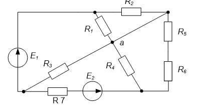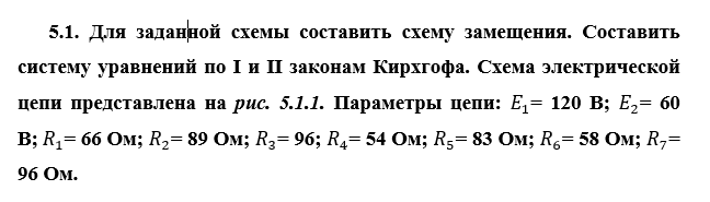 Для заданной схемы составить схему замещения. Составить систему уравнений по Ⅰ и Ⅱ законам Кирхгофа. Схема электрической цепи представлена на рис. 5.1.1. Параметры цепи: = 120 B; = 60 B;= 66 Ом; = 89 Ом; = 96; = 54 Ом; = 83 Ом; = 58 Ом; = 96 Ом.