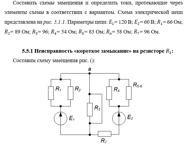 Составить схемы замещения и определить токи, протекающие через элементы схемы в соответствии с вариантом. Схема электрической цепи представлена на рис. 5.1.1. Параметры цепи: = 120 B; = 60 B;= 66 Ом; = 89 Ом; = 96; = 54 Ом; = 83 Ом; = 58 Ом; = 96 Ом.