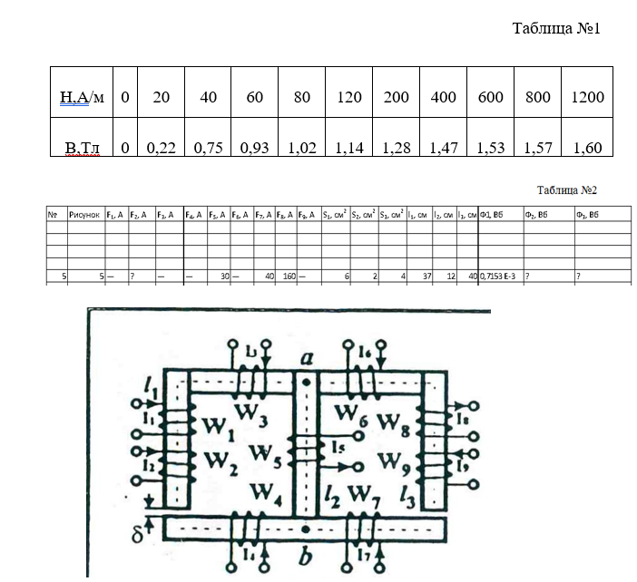 1. Упростить схему магнитной цепи со стальным магнитопроводом в соответствии с заданным условиями (таблица №2). Для нелинейной магнитной цепи построить кривую намагничивания (таблица №1), совмещенную с характеристикой относительной магнитной проницаемости стали (формат А4), рассчитать магнитные характеристики участков сердечника и воздушных зазоров, заполнить соответствующие таблицы. Построить вебер-амперные характеристики элементов магнитной цепи (формат А4)