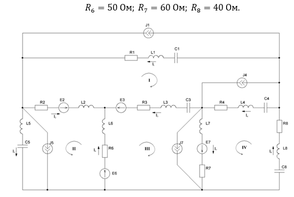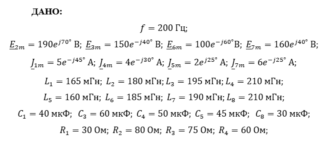 В линейной электрической цепи, схема которой представлена на рисунке 1, имеющей в своем составе резисторы, катушки индуктивности и конденсаторы, действуют синусоидальные источники ЭДС ek = Ekmsin(𝜔𝑡 + 𝜓ₖₑ) и тока jk = Jkmsin(𝜔𝑡 + 𝜓ke), где 𝑘 — порядковый номер обобщенной ветви (𝑘 = 1,2,...,8). Параметры пассивных элементов ветвей (rk, Lk и Ck) приведены в таблице 1.1, а параметры источников ЭДС 𝑒k и тока 𝑗k.