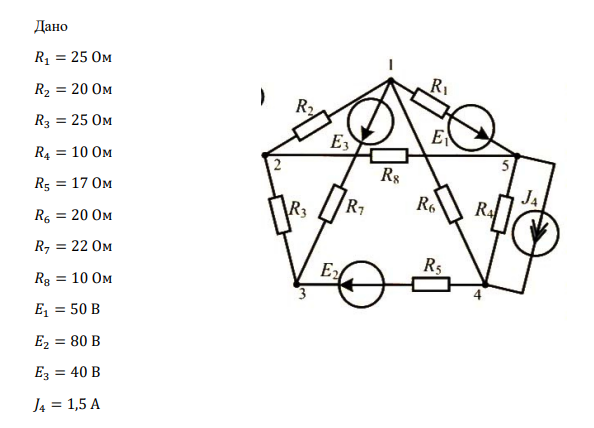 1.Рассчитать все токи, методом узловых потенциалов, используя матрично-топологический подход. 2. Рассчитать все токи, методом контурных токов, используя матрично-топологический подход. 3. Рассчитать баланс мощностей. 4. Подтвердить расчеты пунктов 1, 2, проделав работу в среде electronics Workbench 5. Убрать ветвь с сопротивлением R8; Рассчитать ток в ветви с сопротивлением R4, методом эквивалентного генератора. Построить выходную характеристику генератора и график зависимости мощности от тока Р(I) и сопротивления нагрузки Р(Rн). 6. Сделать выводы по проделанной работе.