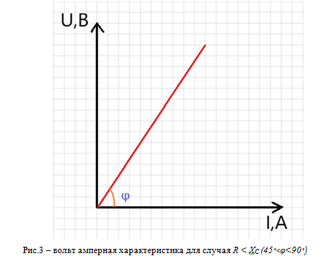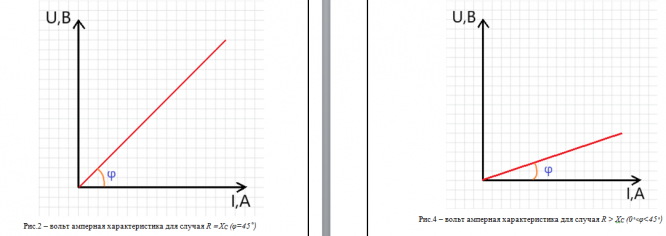 1.1. Для установки соотношений R = XС, R < XС, R > XС необходимо сравнить значения на V1 и на V2. Для случая, когда R = XС (рис.2), показания вольтметров должны быть равны. Для случая, когда R < XС (рис.3), показания V1 должны быть меньше показаний V2. Для случая, когда R > XС (рис.4), показания V1 должны быть больше показаний V2.