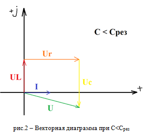 1.2. Качественно построенные векторные диаграммы исследуемой цепи (рис.1) для различных значений емкости C представлены на рис.2-4.