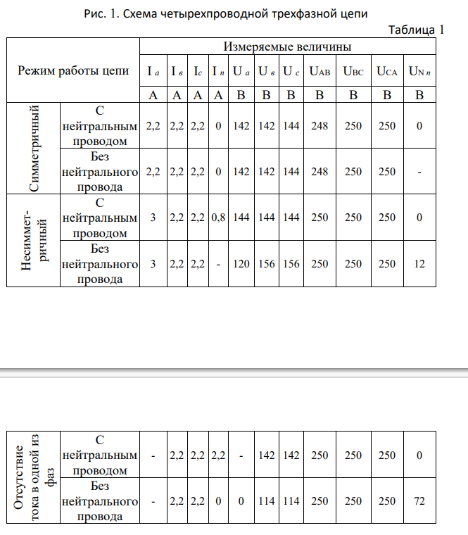 Цель – исследование трех однофазных приемников, соединенных в звезду с нейтральным и без нейтрального провода при различных режимах работы цепи.