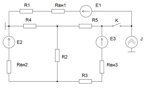 - токи всех ветвей цепи при замкнутом и разомкнутом положении ключа К, которым к цепи присоединяется источник J;