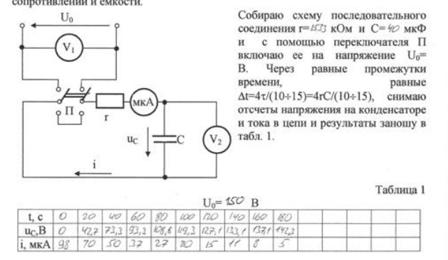 Собираю схему последовательного соединения R = 1533 кОм и С = 40 мкФ с помощью переключателя П и включаю ее на напряжение Uo. Через равные промежутки времени, равные Дt = 4т/(10÷15) = 4R*C/(10+15), снимаю отсчеты напряжения на конденсаторе и тока в цепи и результаты заношу в табл. 1.