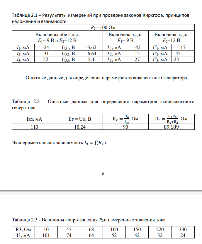 ля исследования электрической цепи по схеме рисунок 2.2 протокола измерений используют: источники постоянного напряжения из блока МОДУЛЬ ПИТАНИЯ: э. д. с. Е1 = 9 В (UZ1), Е2 = 12 В (UZ2); измерительные приборы из блоков МОДУЛЬ ИЗМЕРИТЕЛЬНЫЙ постоянного тока. Пассивные элементы электрической схемы выбирают из блока МОДУЛЬ РЕЗИСТОРОВ. − Собрать электрическую цепь по схеме, приведенной на рис. 1П. Рекомендуемые значения R1= 100 или 150 Ом; R2= 100, 150, 220 или 330 Ом. При сборке электрической цепи воспользуйтесь схемой соединения модулей из протокола измерений (рисунок 2.3). − Проверить собранную электрическую цепь в присутствии преподавателя. − Включить автоматический выключатель QF блока МОДУЛЬ ПИТАНИЯ. Включить тумблер SA1 источников э. д. с. UZ1 и UZ2. − Установить величину резистора R3, при которой напряжение на резисторе будет 4-7 В. Стрелки амперметров PA1, PA2 и PA3 блока МОДУЛЬ ИЗМЕРИТЕЛЬНЫЙ должны отклоняться вправо. Величину сопротивления R3 занести в протокол измерений. − В протоколе наблюдений указать на схеме замещения положительные направления токов в ветвях, совпадающие с действительными направлениями. В 6 последующих опытах эти направления принять как положительные и при отклонении стрелки амперметра влево, измеренному значению тока приписывать знак минус. 2.1 Проверка выполнения законов Кирхгофа: − измерить величины э. д. с. Е1 источника UZ1 и Е2 источника UZ2. Измерить величины токов ветвей и напряжений на сопротивлениях цепи. Все измеренные величины занести в таблицу 2.1 протокола измерений. 2.2 Проверка выполнения принципов наложения и взаимности: − исключить из цепи э. д. с. UZ2 (рисунок 2.4). Измерить величины токов ветвей. Измеренные величины занести в таблицу 2.1. Восстановить схему цепи. − исключить из цепи э. д. с. UZ1 (рисунок 2.4). Измерить величины токов ветвей. Измеренные величины занести в таблицу 2.1. Восстановить схему цепи. 2.3 Определение параметров эквивалентного генератора: − в режиме короткого замыкания (R3 = 0) измерить ток Iкз. − в режиме холостого хода (ветвь с R3 разомкнута) измерить напряжение Uо. Данные измерений занести в таблицу 2.2. Восстановить схему цепи. 2.4 Определение экспериментальной зависимости 𝑰𝟑 = ƒ(𝑹𝟑): − Измерить ток I3 для указанных в таблице 2.3 величин сопротивления R3. Данные измерений занести в таблицу 2.3 протокола. − Утвердить протокол измерений у преподавателя. − Выключить автоматический выключатель QF блока МОДУЛЬ ПИТАНИЯ. 2.5 Протокол измерений к лабораторной работе № 2 «Линейная электрическая цепь постоянного тока»