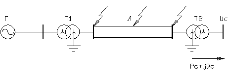 Рассмотрим схему (рис.1.1) электропередачи, в которой генератор работает через трансформатор и двухцепную линию электропередачи на шины приемной системы бесконечной мощности. Генератор не имеет АРВ. В одной цепи линии происходит короткое замыкание, к