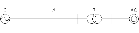 Задача № 15Б. Рассчитать возможность самозапуска пяти асинхронных двигателей с фазным ротором после отключения короткого замыкания. Двигатели питаются от системы мощностью короткого замыкания 400 МВА через линию длиной 25 км и трансформатор мощностью 25 МВА, Uном = 35/6,3 кВ, Uк = 7,5 % (рис.2.1). Нагрузка на валу двигателей вентиляторная. Время перерыва питания равно: а) 0,4 с; б) 0,8 с; в) 1,1 с.