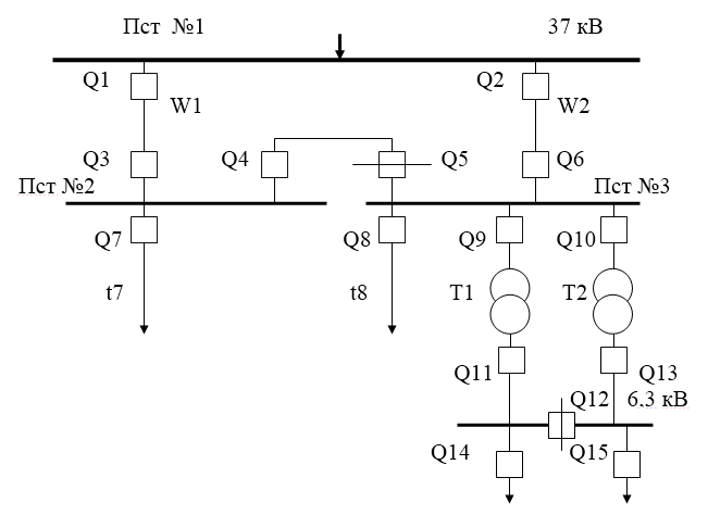 В таблице указаны также время срабатывания защит t7, t8, t14, t15 выключателей Q7, Q8, Q14, Q15 соответственно и мощности трансформаторов Sт1 ном, Sт2 ном.