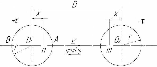 Для студентов по предмету Теоретические основы электротехники (ТОЭ)Два провода діаметром d=10мм розташовані паралельно. Відстань між осями проводів D=40мм. Заряд кожного провода на 1м довжини Q=10-8 Кл. Лівий провід нДва провода діаметром d=10мм розташовані паралельно. Відстань між осями проводів D=40мм. Заряд кожного провода на 1м довжини Q=10-8 Кл. Лівий провід н
