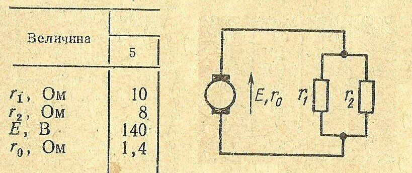 Для цепи (рисунок и таблица ниже) э.д.с. источника Е1 внутреннее сопротивление r0. Сопротивления электроприемников r1 и r2. Определить токи в сопротивлениях r1 и r2, напряжение на зажимах электроприемников и составить уравнение баланса мощностей.